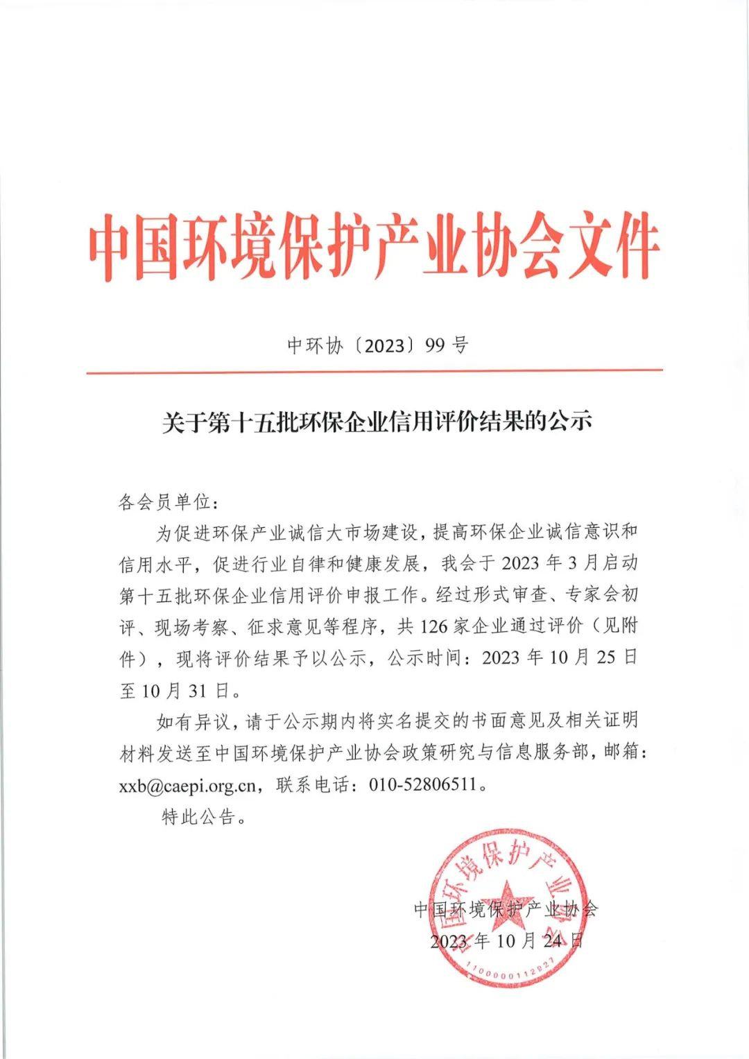 10月31日,在2023年中環協第十五輪環保企業信用評價中,四川省天晟源環保股份有限公司(簡稱:“天晟源環保”)再次榮獲中國環保產業協會授予的“AAA級環保企業信用評價”榮譽。這是天晟源環保繼2020年首次獲得該項榮譽并期滿后,再次以優秀的表現和扎實的環保業績獲得此項頂級評價。