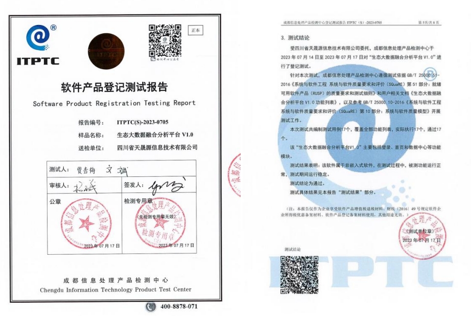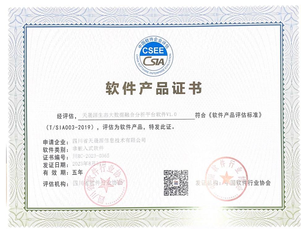 天晟源環保信息子公司生態大數據融合分析平臺 通過軟件認證,獲頒軟件產品證書