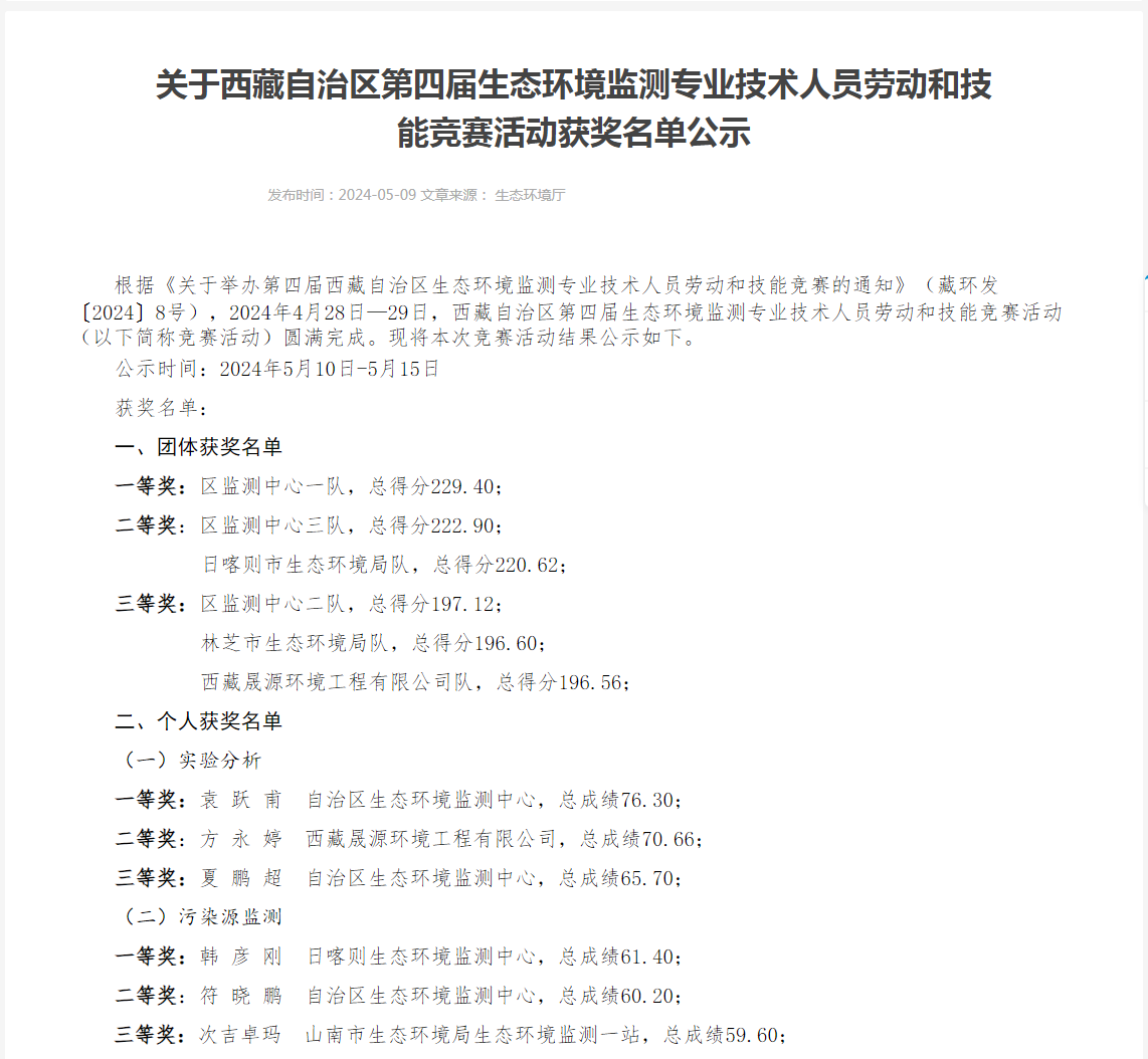 2024年5月9日,西藏自治區生態環境廳公布2024第四屆西藏自治區生態環境監測專業技術人員勞動和技能競賽(簡稱“第四屆大比武”)獲獎名單,四川省天晟源環保股份有限公司子公司西藏晟源環境工程有限公司(以下簡稱“西藏晟源”)榮獲團體獎三等獎,在第三方社會監測機構中名列第一,同時方永婷斬獲實驗分析組個人獎項二等獎。繼第三屆大比武獲獎后,西藏晟源在第四屆大比武中再創佳績,展現了西藏晟源在西藏自治區區內環境監測領域的過硬實力。